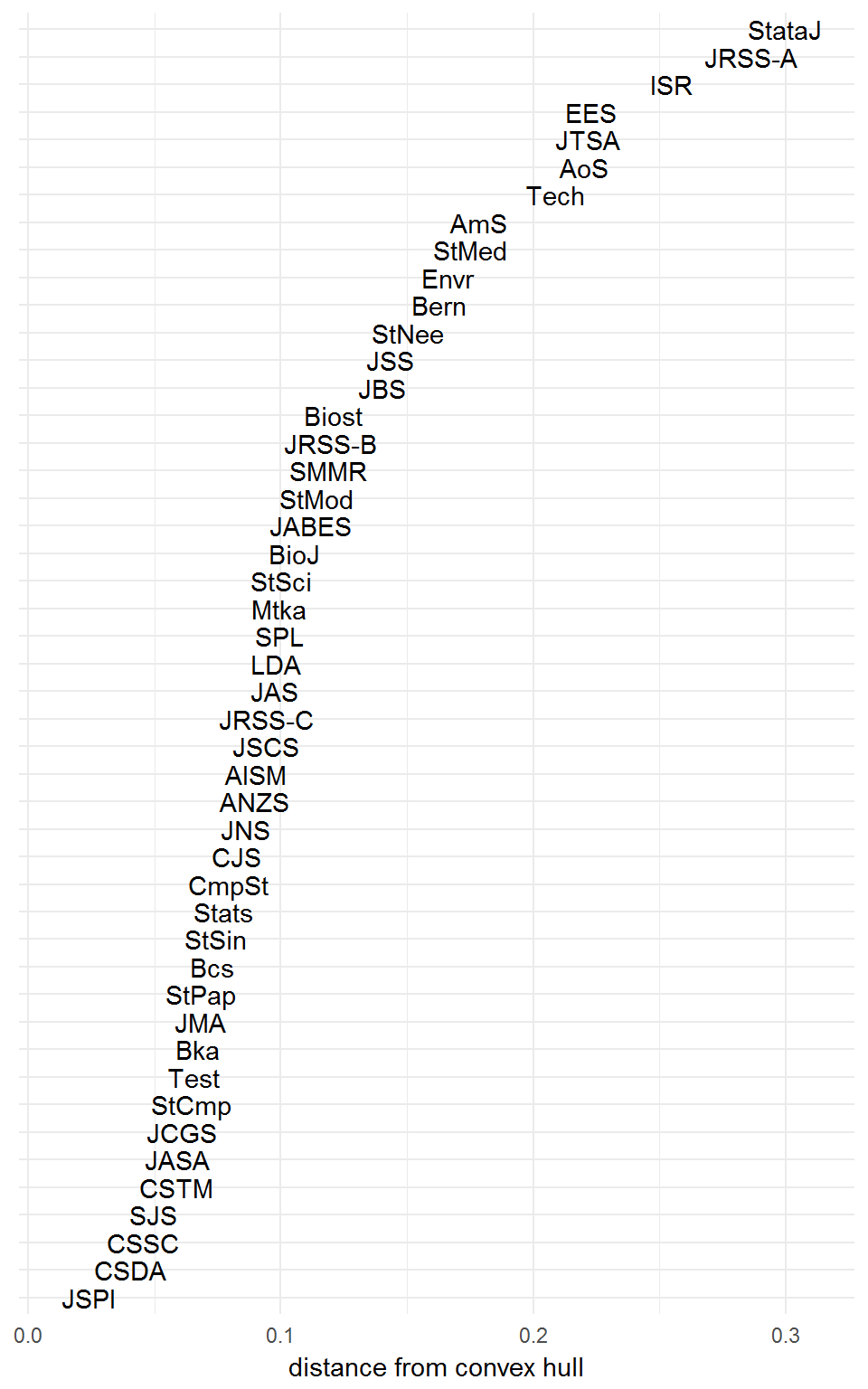 From the output, the combination vector is \(\begin{pmatrix}0&0&1&0\end{pmatrix}\), and AoS’s journal profile has distance 0 from the convex hull. This should be intuitive—as a singleton community, AoS’s journal profile is a community profile.