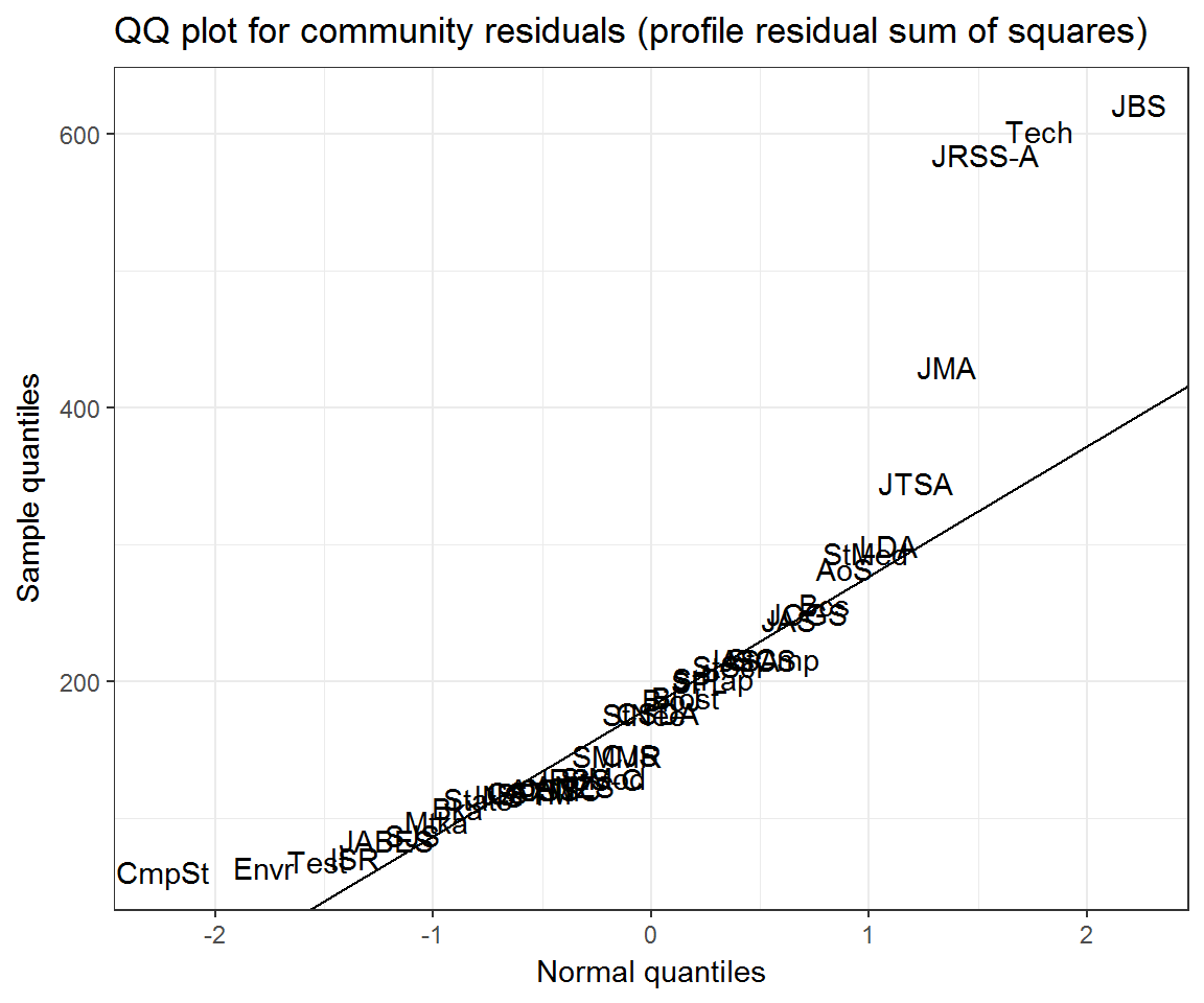 title = "QQ plots of profile residuals for 'JRSS-A' and 'Technometrics'",