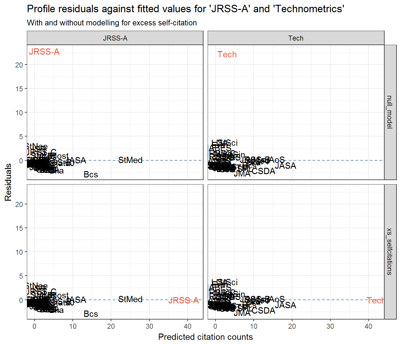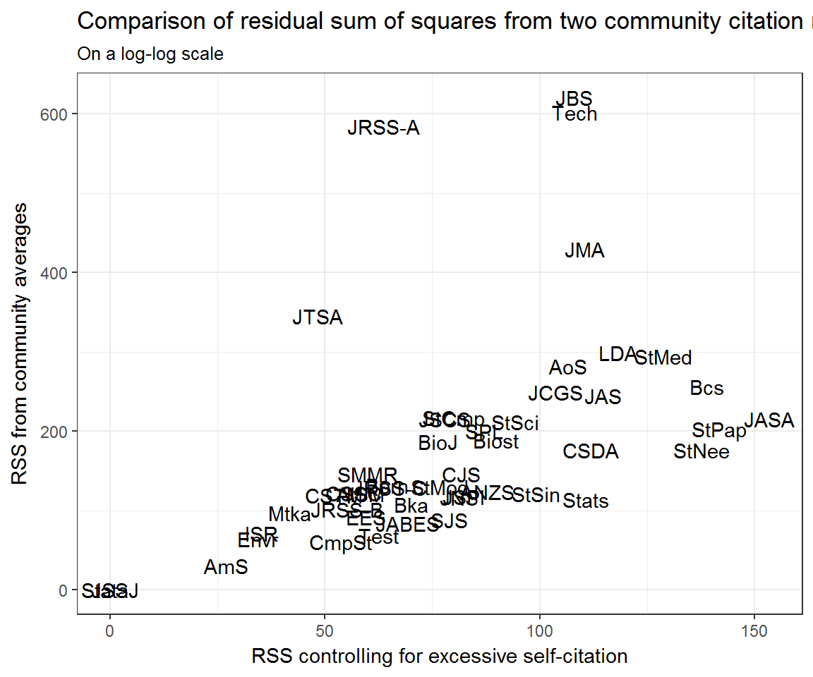 If we look back at the section Community residuals controlling for self-citation then it is clear that the extreme residuals exhibited by JRSS-A and Technometrics are effective nullified by controlling for excess self-citation.